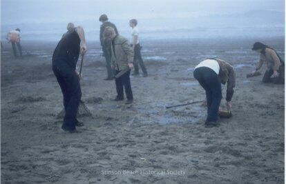 A color photographic print made from a slide showing 8 people cleaning the beach with rakes and pieces of wood in foggy conditions. This is probably in front of the State Park.Collection