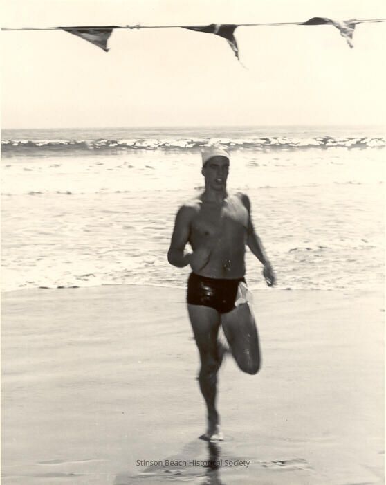 B&W 8x10 photo shows a young man running out of the surf, one leg is touching the sand and the other is raised at the knee. He is in black swim trunks (with some sort of white kerchief attached at the waist) and wears a white bathing cap. He is passing under an overhead finish line to which 3 triangular flags are attached and blowing in the wind. At a distance in the background a wave is beginning to break.Collection