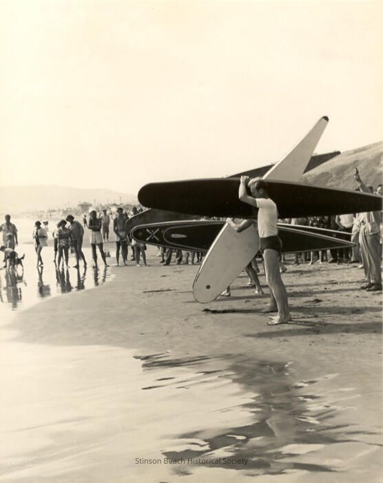 B&W photo shows a number of surfers (maybe 5 or 6) with their boards lined up and ready to go into the surf. Only the first surfer is visible and he is dressed in black trunks and white t-shirt. There is a bit of a crowd of onlookers visible along the waters edge and more, not so visible, on the beach on the far side of the surfers. Also visible at the far right is a man holding a gun up in the air to signal the start of the race. Farther down the beach can be seen the roofs of houses on the beach and the outline of Bolinas Mesa. It seems to be hazy conditions.Collection