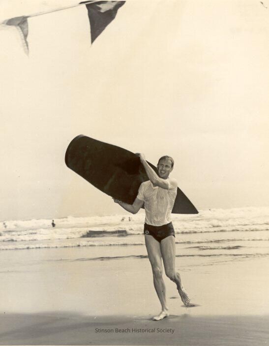 B&W photo of a smiling young gentleman walking out of the ocean carrying his surfboard over his shoulder. He has short blondish hair plastered to his head and wearing a white t-shirt and black tight-fitting swim trunks. He is about to pass under a finish line on which 2 triangular flags are visible. The surf is rolling in in the background. There are only 2 or 3 other people in it at a distanceCollection