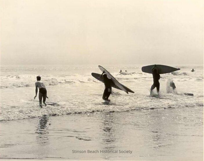 This is a black and white photo taken from the beach and showing four men in swim trunks entering the water. One is at the left of the picture, two are together in the center and a third is at the right. The two in the center and the one on the right are carrying surf boards on their shoulders. The head and shoulders of two other people are seen further out in the surf.