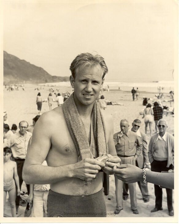 This is a black and white photo taken at the beach. In the center foreground is a young man in bathing trunks with a towel draped around his neck and across his shoulders. Immediatly behind him on the right are three men in street clothes (pants and shirts). Behind him on the right are a man in pants and shirt and a young boy in swim trunks. Farther back toward the ocean are several people in beach attire, with the ocean in the background.