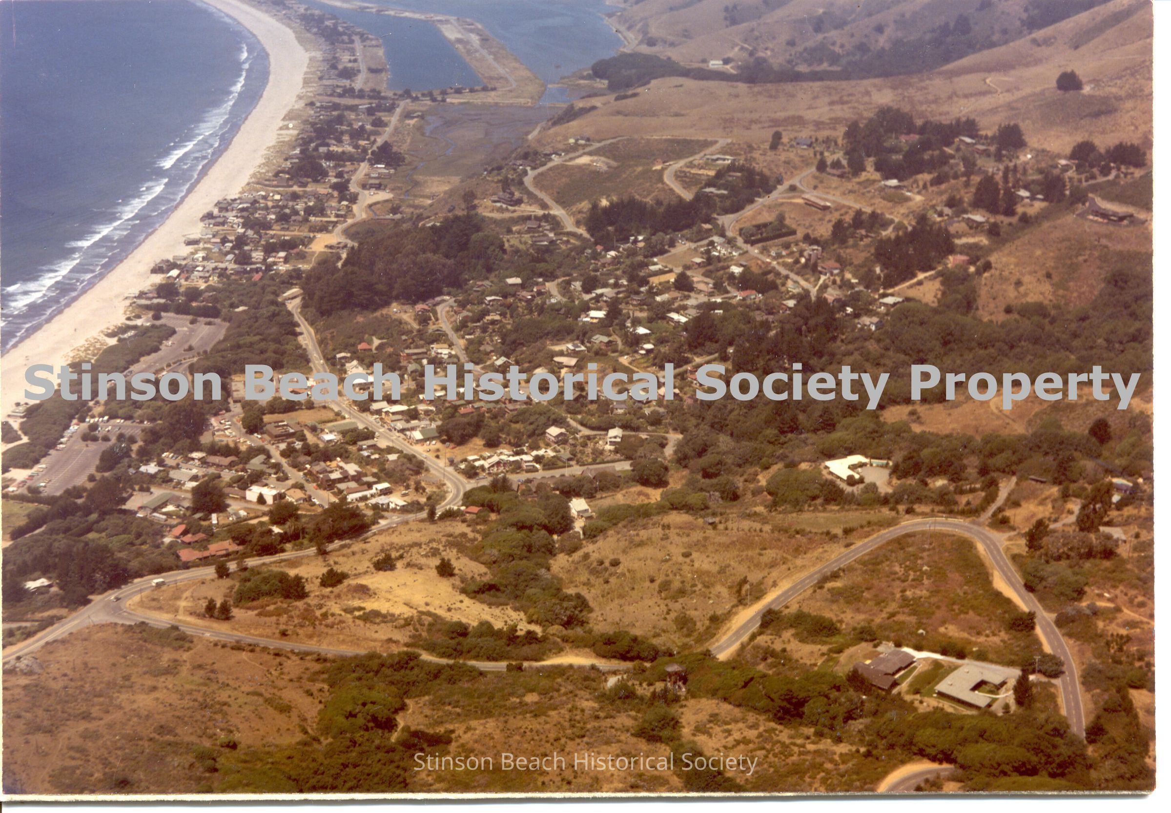 This color aerial photograph of the town of Stinson Beach is mounted on cardboard. It shows the beach itself and the bay in the upper left corner with the sandspit as far as the end of the man-made Seadrift lagoon and the Seadrift houses paralleling it. The whole town of Stinson Beach takes up the center of the photograph including the Calles and Patios, old town on the flats, old town on the hill and the Highlands. The paved parking lots of the State Park are on the left side of the picture, just off the beach. In the foreground is Panoramic Highway and the houses bordering it.Collection