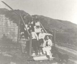 A (low-contrast) muted (partial) photograph of 8 women (and at least one man - probably the teacher) sitting on wooden steps of a building that is not visible - only the shingles on the stairs that continue up and curve to the left. There are banisters on either side of the stairs and a black dog at the bottom who is looking up at another dog who is standing on the bottom step in front of a person who may be the teacher. The rolling hills of Mt. Tamalpais can be seen in the background.Collection