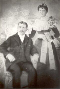 Classic portrait of a seated man in formal attire and a woman in ruffles and bows standing beside and slightly behind him, with her hand resting on his shoulder (or maybe the back of the easy chair he's sitting in). He has short hair, slick and parted in the middle, and a carefully trimmed moustache. He is dressed in black suit with a vest and white collarless shirt. His arms are resting on the arms of the chair. She is wearing a long dark dress with a ruffled collar that extends over the shoulders and has a wide white sash tied into a large bow at her hip. Her hair is pulled back and held with some sort of adornment and she has one curl in the middle of her forehead. A fancy circular prop of wicker and lace appears to serve as a faux back to the chair.Collection