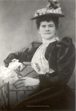 Formal portrait of a woman in Victorian dress (dark satiny jacket with bouffant sleeves and high-collared floral print blouse) and flat brimmed hat with white curly stuff on top, sitting on an open-backed wooden chair with her arm resting on the top meeting the bouquet of flowers she hold in front of her in her other hand. Her body is turned slightly to one side so she is looking slightly over one shoulder. She has a hint of a smile. Her hair is worn up under her hat.Collection