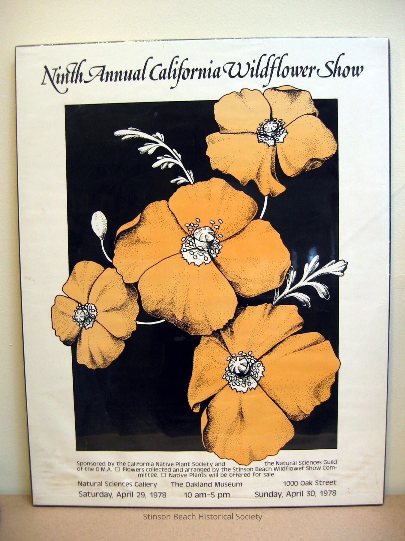 This is the poster created by the Natural History Gallery of the Oakland Museum for the 9th annual California Wildflower show. It was held on Saturday and Sunday of April 29 & 30, 1978. It was sponsored by the California Native Plant Society and the Natural Science Guild of the OMA. Flowers were collected and arranged by the Stinson Beach Wildflower Show Committee which organized the same show in Stinson Beach Community Center for previous 10 years. The poster shows orange California poppies against black background.Collection