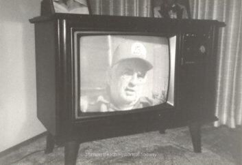A black and white photographic print shows a closeup of a man in a cap (emblem unreadable) facing the sun giving an interview on TV, making the picture that we see in the photo of a television set. He appears to be talking into the camera and is possibly wearing the type of clothing he wore as a construction worker on the Golden Gate Bridge.Collection