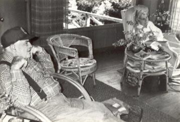 An older, gray haired couple sit in their house which is casually furnished with wicker and rattan chairs and tables. The woman is in a lounge chair and seems drowsy. The man (Frenchy Gales) has his hand to his chin, is wearing suspenders over a plaid shirt and with trousers. Outside the window the railing of a deck or porch shows and large shrubs. The back of the black and white photograph is stamped "Processed by Kodak Nov 84PCollection
