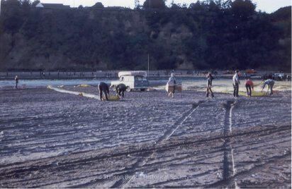 A color photographic print made from a slide showing several people walking, standing, working. Shows a floating barrier boom at the channel and one laying on the beach. It appears to be close to evening, and shows the channel and the Bolinas Cliff. A panel truck with a canoe on the rack is on the beach and couple of the people are carrying boxes, perhaps to carry oiled birds.Collection