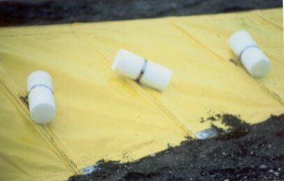 A color photographic print made from a slide showing a floating barrier boom detail. It looks like a yellow canvas material on which floating devices are attached at intervals.Collection
