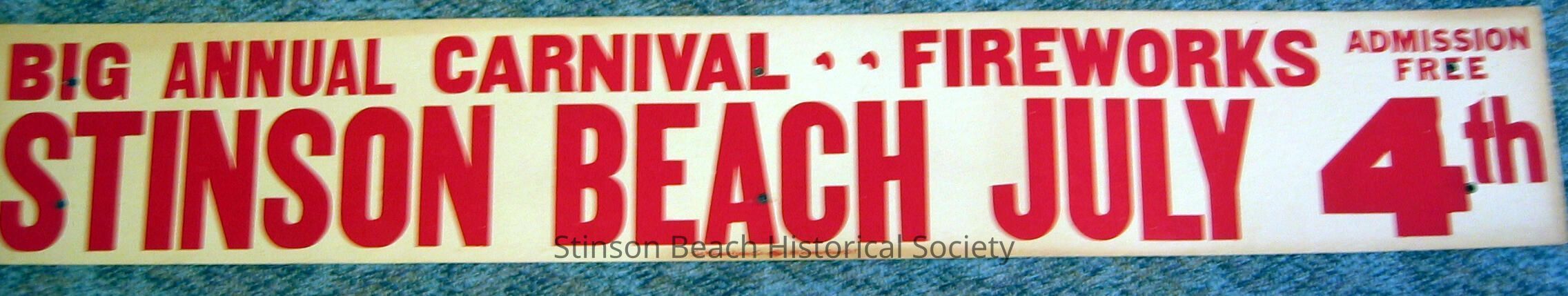 This poster is printed on 6 x 42-inch cardboard with grommets to hang (?). It advertises July 4th at Stinson Beach in bold red letters.Collection