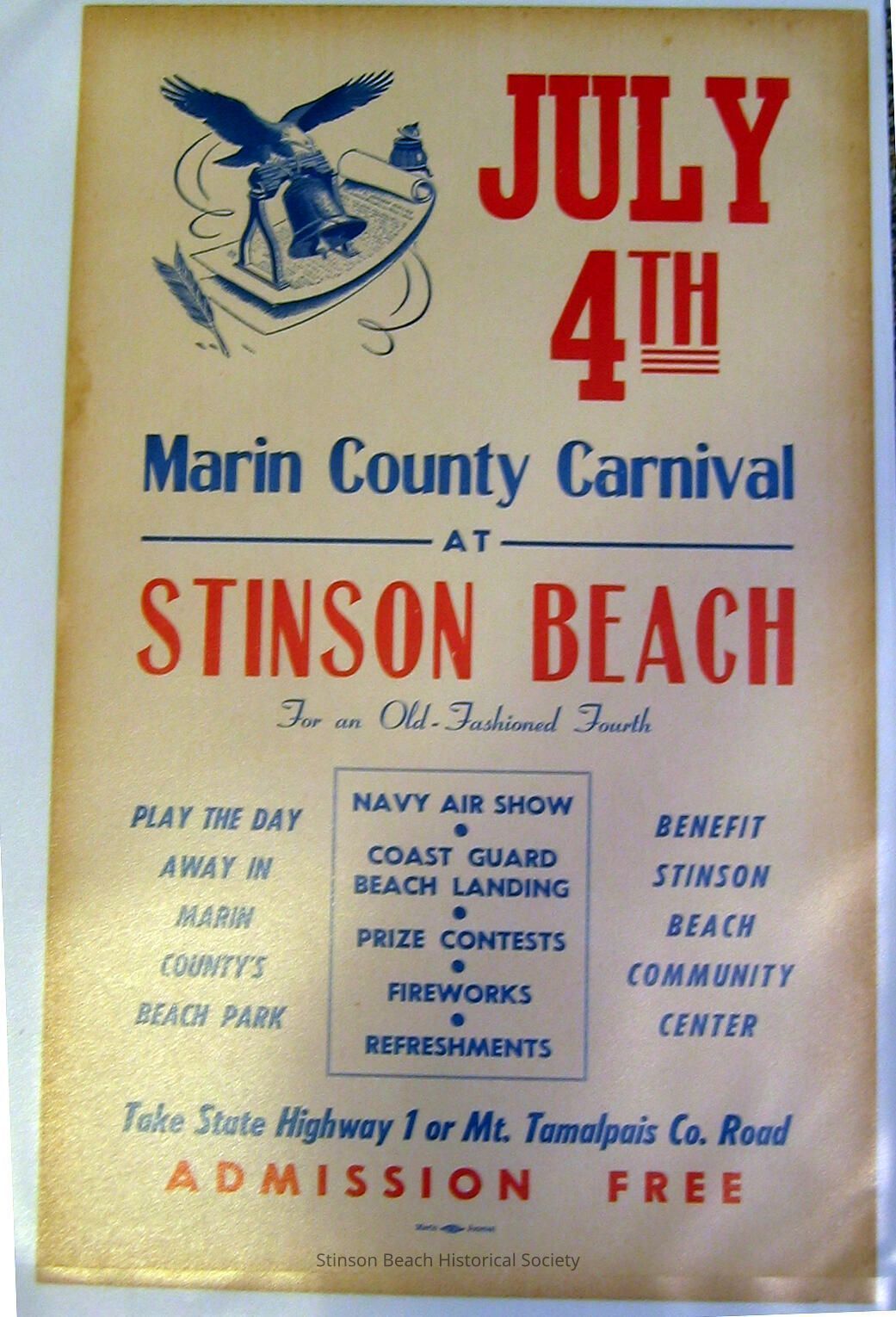 14 x 22-inch poster printed on a poster board in red and blue inks. The Marin County Carnival held at Stinson Beach benefitted Stinson Beach Community Center and included a Navy Air Show, Coast Guard Beach Landing, Prizes, Contests, Fire Works and refreshments. Admission was Free.Collection