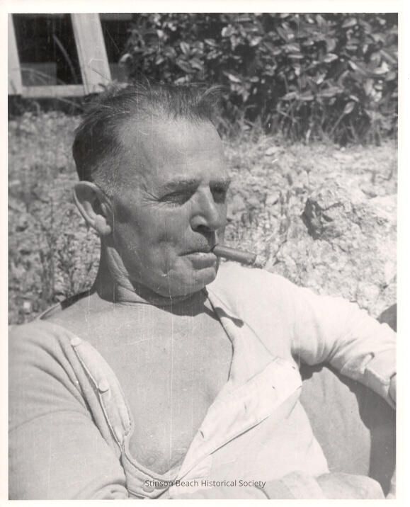 This is a close up, black and white photo of a man. He is smoking a cigar and appears to be relaxing, leaning against a cushion. He is wearing a white long sleeved undershirt, partly unbuttoned. Grass and rocks are in the background.Collection