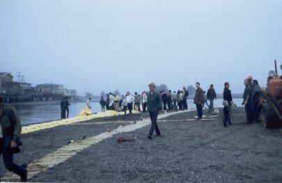 A color photographic print made from a slide showing a floating barrier boom being laid across the Bolinas Channel from the tip of Seadrift. A lot of people are working around it. The first section of it is being put into the water. Across the channel, you can see the houses on the Bolinas Wharf and Kent Island.Collection