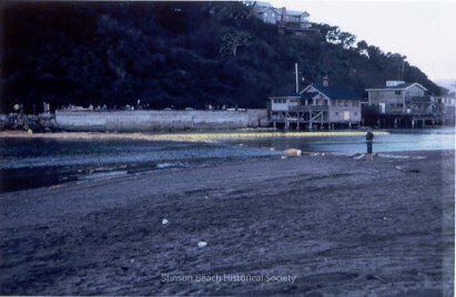 A color photographic print made from a slide showing a floating barrier boom laid across the Bolinas Channel. Across the channel, you can see the houses on the Bolinas Wharf. Lone person stands on the Seadrift side of the beach.Collection