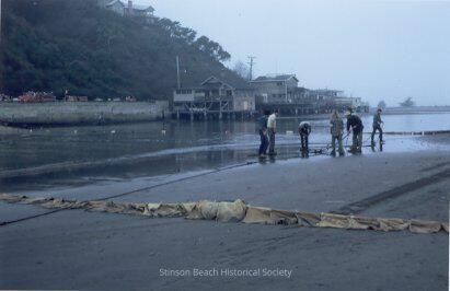 A color photographic print made from a slide showing a floating barrier boom laid across the Bolinas Channel. The boom is almost submerged except nearer to the shore. Across the channel, you can see the houses on the Bolinas Wharf. Six men are working on the Seadrift side of the beach. The second set of the barrier boom is seen in the foreground of the photo.Collection