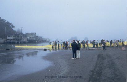 A color photographic print made from a slide showing a floating barrier boom being laid across the Bolinas Channel. The boom is held by many people helping on the Seadrift side of the channel. Across the channel, you can see the houses on the Bolinas Wharf and trees on Kent Island.Collection