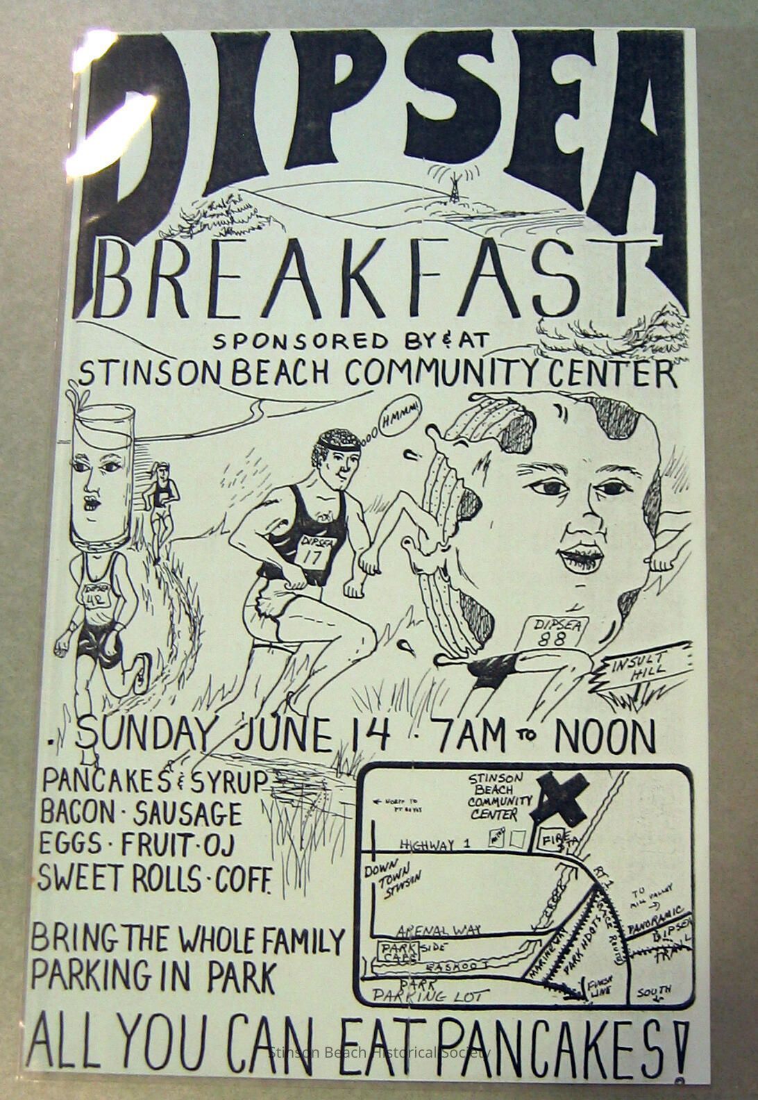 A poster announcing the Dipsea Breakfast for June 14, 1981. The breakfasts were served by Stinson Beach Community Center inc. for its Fundraising aiming at the people who come over for the Dipsea Race. All you can eat pancake breakfasts were served from 7 am to 12 noon at the community center hall.Collection