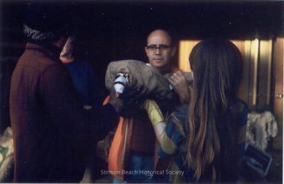 A color photographic print made from a slide showing 4 people helping an oil covered bird (sea scouter). The bird's head sticks out of the burlap bag is covered by blindfold.Collection