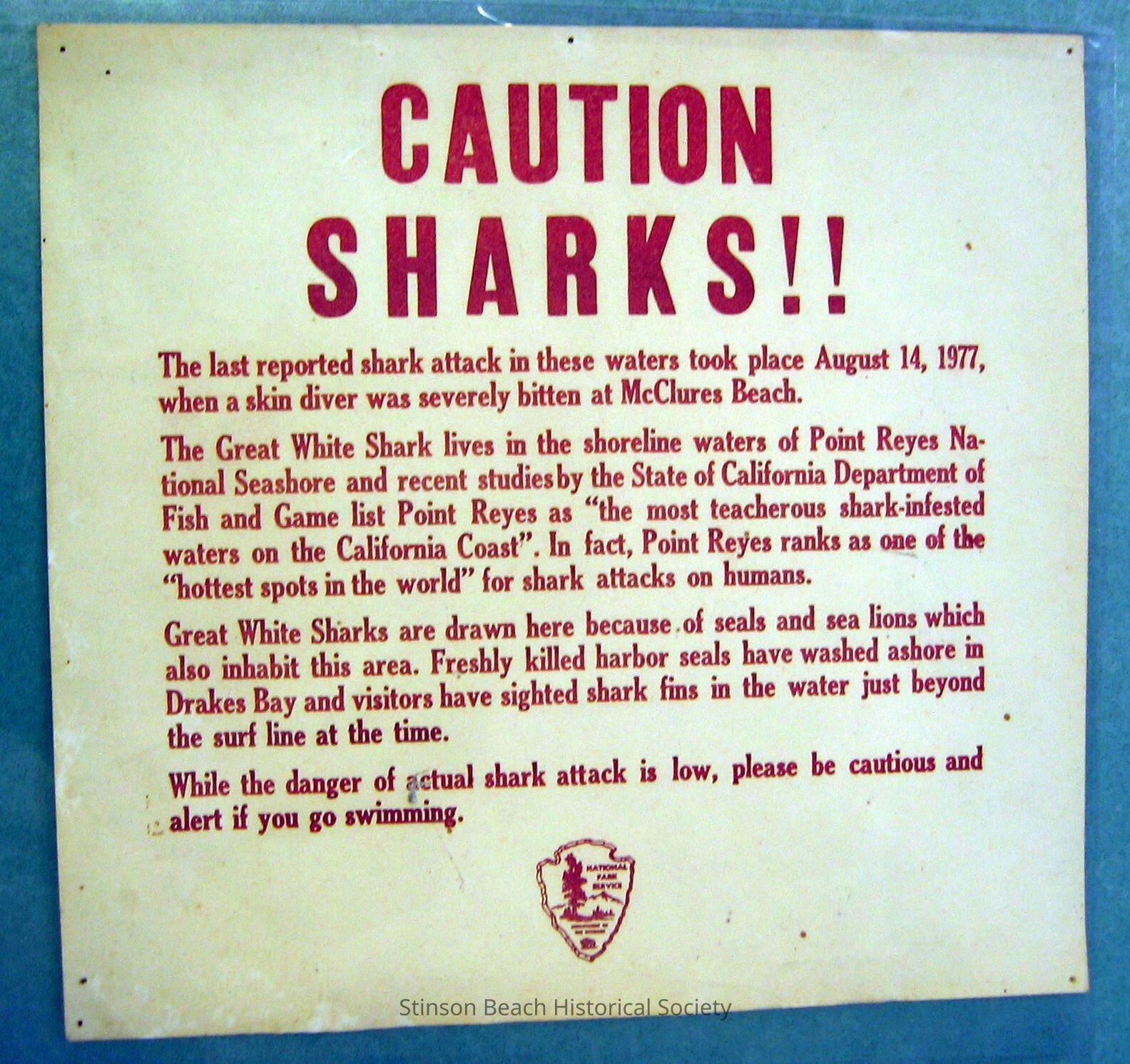 A warning poster for the visitors to the Point Reyes National Seashore about the danger of Great White Shark attacks. The last reported shark attack is thought to be August 1977. A shark attack warning or sighting has been posted almost yearly at Stinson Beach Park of GGNR since.Collection
