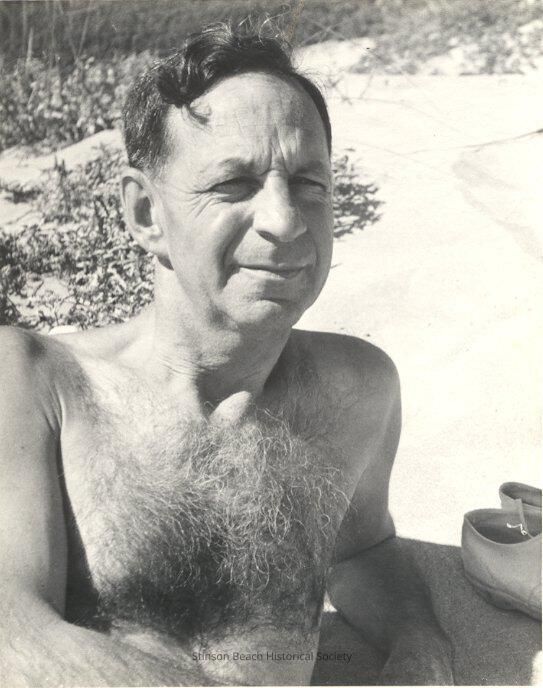 B&W photo of a man resting on one elbow, reclining on the sand in the dunes. He is squinting into the distance. His dark hair, parted on the side, has one curl extending down the side of his forehead. He has a hairy chest, which appears to be graying. There is dune grasses behind him and a pair of white tennis-type shoes beside his elbow.Collection