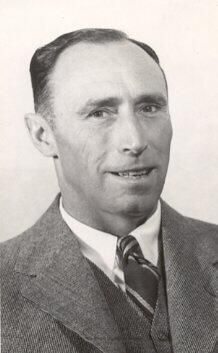 B&W photo postcard of a man in a suit, vest and striped tie. His dark hair is thinning on top, his nose is straight and his lips are slightly apart in a partial smile showing his teeth. The back of the postcard (addressed to Mrs. W. G. Airey, Sea Beach Hotel, Stinson Beach, Calif.) reads: