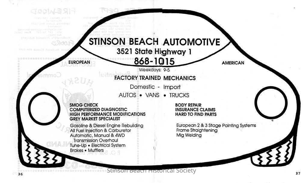 The center fold advertisement in the Bolinas Yellow Page of Stinson Beach Automotive. It existed in the concrete block building (Originally 7-11 store, now the SB Library) for about a year after the Chevron Gas Station was demolished. It was operated by Buck Myers, a local mechanic, and Chris who worked at the gasoline station. A minor fire caused it to be closed. This page advertises various services it performed - smog check, computerized diagnostic, body repair, insurance claim works, etc.(TA)Collection
