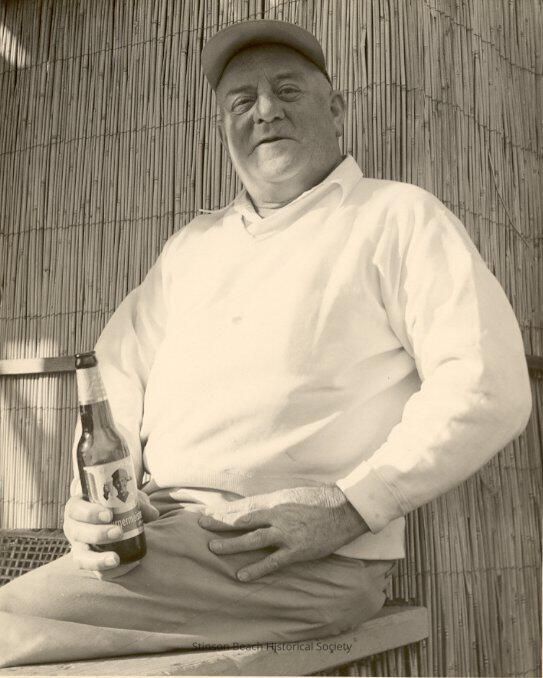 This black and white photograph is a closeup of a heavy-set man posed against a rush screen, sitting on a ledge with a bottle of Burgemeister beer in his right hand. He wear slacks with a light colored long sleeved sweater or sweatshirt over a light open throut shirt. His baseball cap is rolled back from his forehead and he has a half smile on his face. The back of the photograph has an ink written " Nov. 18 1961".Collection
