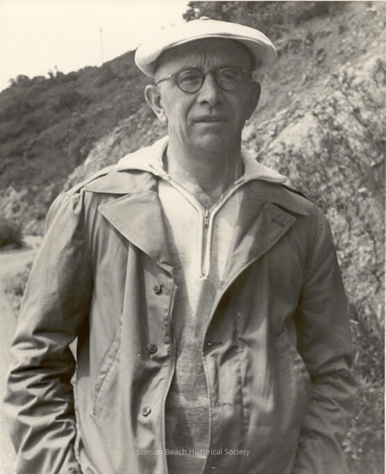 This black and white photograph is of a man from the waist up. He is wearing a collared pullover with a zipper to mid-chest under a loose wind breaker type jacket. He is wearing dark rimmed, clear glasses and a newsboy/golfers cap.He is looking directly at the camera but is not smiling. There are rocky hills in the background and a road behind him.Collection