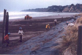 A color photograph depiction black plastic cloth underlayment are being laid on top of the pushed up sand base. A group of workers, probably some members of California Conservation Corps among the workers. Bolinas point and surf of the Stinson is on the background. A bulldozer is on the beach. On the back of the photo is written:4 Cloth is laid down.Collection