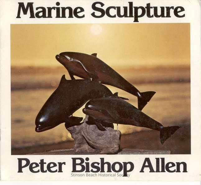 A booklet printed in color showing sculptures made by Peter Bishop Allen. Booklet has 6 pages and cover. On the back cover, his photograph with him standing on the Stinson Beach and his short biography are on. The front page shows 3 Pacific Bottlenosed Dolphins each 15 inches long on a drift-wood pedestal, Walrus 11" high, Great White Shark 31" long, California Sea Lions 12" and 18" high, California Gray Whales (Caw and Calf) 35"long, Sperm Whale 22"long and 2 Killer Whales each 15" long are shown on the following 6 pages.Collection