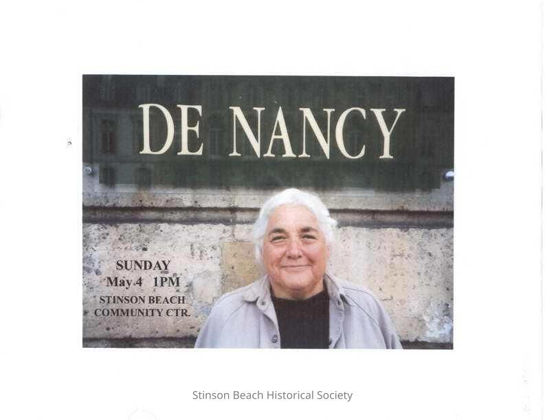 A flyer or a copy of a photograph printed on letter paper. Gold Letter DE NANCY printed on a green material hang in front of a English style stone building. Smiling Nancy in a gray jacket with a black shirts stands in front of it. On the left of her letters are typed, "Sunday May4, 1pm Stinson Beach Community Center. The back drop could have been created using Photoshop or a photograph from her traveling.Collection