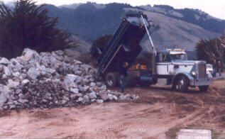 A white dump truck is dumping rocks on the beach at the end of Seadrift. The Stinson Beach Gulch hills in the background.Collection