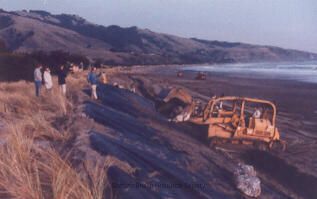 A bulldozer is putting a huge rock on top of the cloth laid on top of the sloped sand. 3,4 people are standing on top of the slope , in the dune grass. Photo is taken looking toward San Francisco. The hills toward San Francisco is on the background and crescent of the beach and sand follows to the toe of the rock wall being built. On the back of the photo reads:6. rocks are put on cloth."Collection
