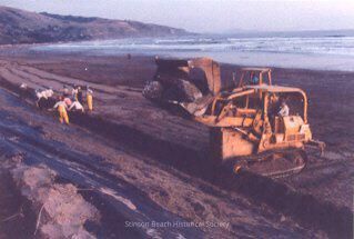 A bulldozer is laying a huge rock on top of the black plastic cloth laid on the sand. The bulldozer stand behind the drift fence and its arm reaches over the fence. 10 workers are working on the fence in distance. The shore of Stinson Beach toward San Francisco is in background.Collection
