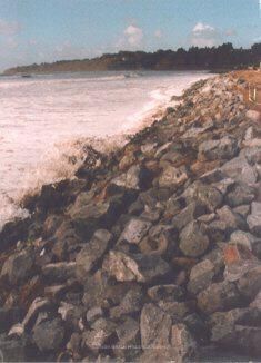 Photograph of the beach and the rock wall looking toward Bolinas point. On the back of photo is written:Rock wall finished before "grooming". The white surf is just caressing the toe of the rock wall.Collection