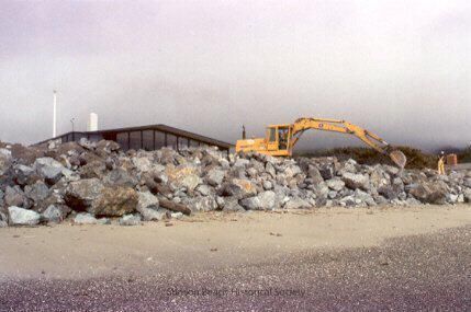 Photo looking at the Rock wall from the top of erosion, in front of houses. A bulldozer is working on top of the wall, now, rearranging stray rocks. A house, perhaps the Lowrey's stands behind.Collection