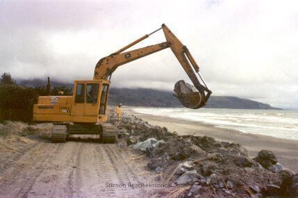 A buldoser is picking or placing a large rock. A work man stands by. They are working from the top of the wall, replacing rocks to right position. On the back of photo is written:8. Grooming rock wall.Collection