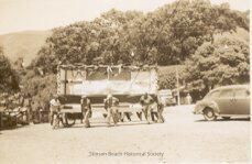 This is a sepia print showing several people moving a carnival booth. There are 4 men facing the front. Only the legs of several others are seen behind the booth. There are large bushes in the background and a car is seen at the right of the picture.Collection