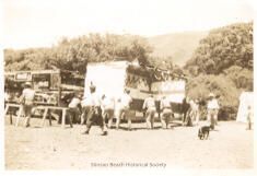This sepia photographic print shows some men moving/setting up a carnival booth. Seven of them are visible. To the right of the booth is a man and a dog and there is another man walking in front of the booth. At ther left side of the picture can be seen another booth already in place, some saw horses and another man walking towards that booth.Collection