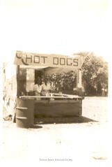 This sepia photograph depicts a booth with a sign across the top saying HOT DOGS. There are two women standing inside the booth. There are shrubs in the background and a trash barrel in front of the booth on the left hand side of the photo.Collection
