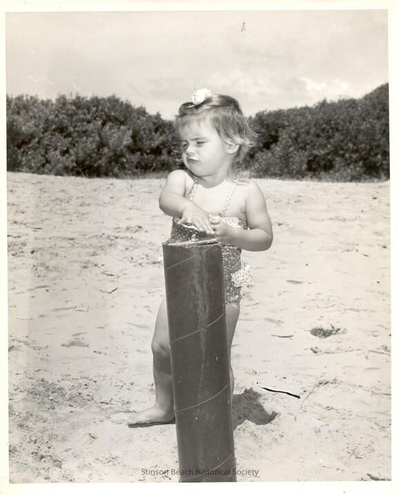 This original black and white photograph shows an unidentified little girl at the beach. Her eyes are closed and she has a pouty look on her face. She is wearing a one piece, polka dot bathing suit.Collection
