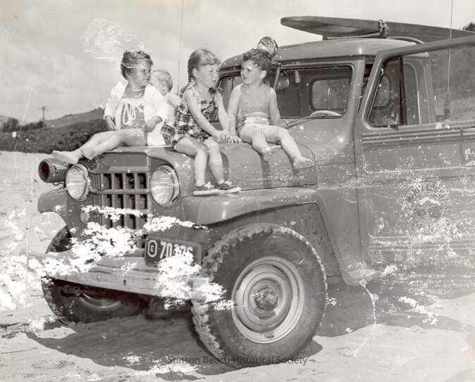 This black and white photograph shows 4 children seated on the hood of a truck. The truck is on the sand and has a surf board attached to the roof. The children are from left to right: a little girl with short hair in a bathing suit and white shirt, a baby partially obscured by the little girl, a little girl with braids and bangs in a plaid bathing suit and sneakers and a little boy in trunks. The boy is looking towards the girl next to him who looks like she wants to be lifted down off the truck and the other girl is looking towards her too. She doesn't look happy.Collection