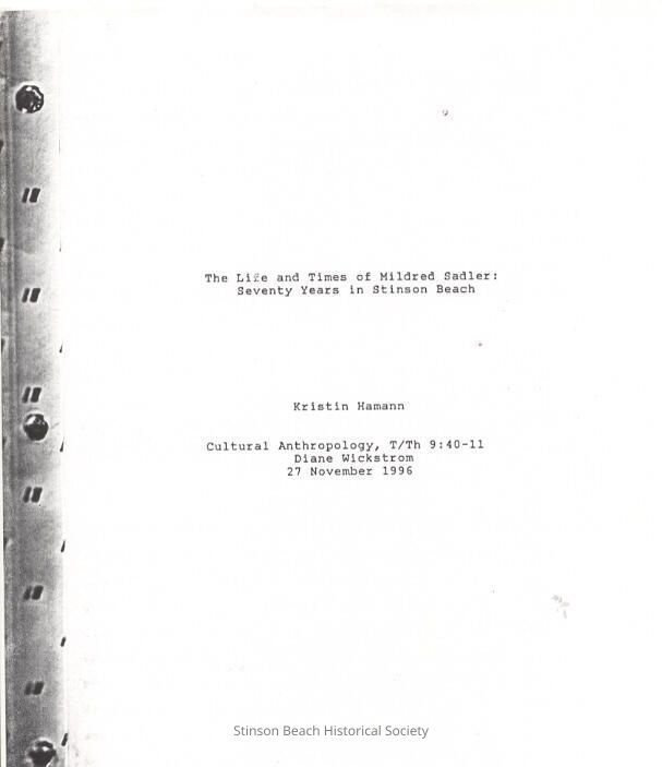 Mildred Sadler describes her memories of over 70 years in Stinson Beach. Mildred came to Stinson to teach in 1926 when she graduated from San Francisco Teachers College. She had 14 students, mainly from the dairies. She married Lester Sadler, a local son, in 1938 and helped build the Community Center, Fire House and Community Church. During World War II Stinson Beach became home to people working in the Sausalito Ship yards and the school double in size, employing Louise Airey to help teach the 40 children.