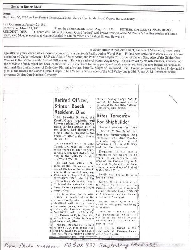 A black and white Xerox copy of photographs of Obituary of Benedict Rupert Mess (May 19, 1899-Aug. 10, 1959) . Benedict Mess was born in Oregon and served in both WWI and WWII and Lieutenant of US Coast Guard. He lived with his wife, Anna Frances, who was a member of McKinnon family. They lived near the Mckinnon's Landing site.Collection