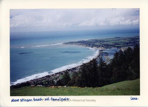 4"x6" color photograph of Stinson Beach taken near Ridge Road is pasted on a backing paper. Written under the photo: Above Stinson Beach, MT. Tamalpais. Signed Lana. It shows the sweep of Stinson Beach and Bolinas Mesa with zig-zag of Seadrift Lagoon and howses there behind a stand of fir trees.Collection