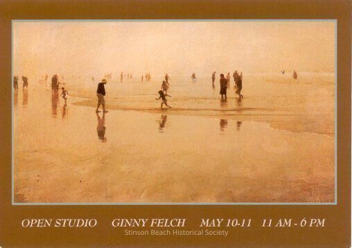 An open studio invitation card from the photographer, Ginny Felch, May 10 -11 of 1998. It shows a photograph of the shoreline with many people wading in the surf and children running through it. It is printed in sepia tone and bordered with a blue line. The back side has the information of the event, place and time.Collection