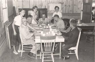 This is a black and white picture taken indoors showing a lunch table with 7 men seated around it. There are three women serving as waitresses in the background. Behind them is a piano and there are some folding tables leaning against the left-hand wall.Collection