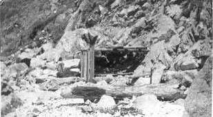 Small B&W photo shows a rocky hillside formation with a square wooden structure that make it appear as an entrance to a cave.Collection